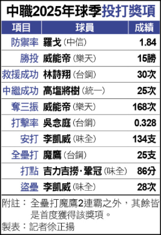 終兩項個人獎都沒能逆風翻盤。李凱威拿下生涯首座打擊獎項,陳晨威則中斷盜壘王3連