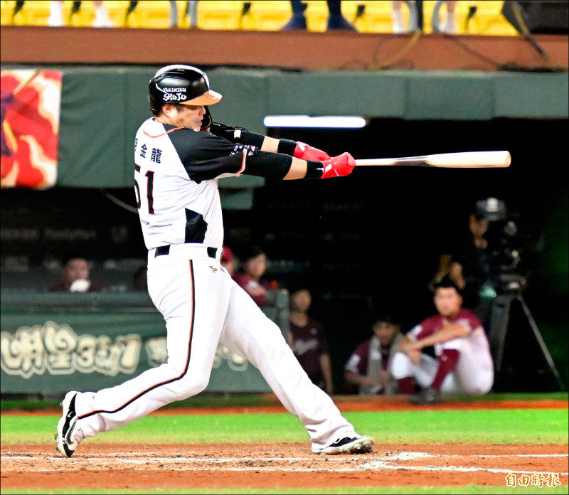 41歲胡金龍生涯例行賽最後打席擊出2分砲,一度幫球隊追平比數。(記者李惠洲攝)