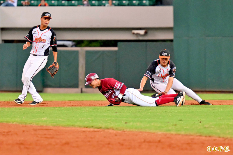 陳晨威3局上嘗試盜壘,在一、二壘間遭夾殺出局。 (記者李惠洲攝)