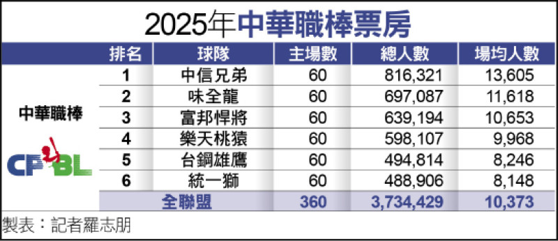 〔記者羅志朋/台北報導〕中華職棒本季360場例行賽總計吸引373萬4229人進場觀戰,場