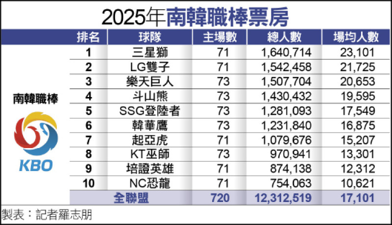 今年韓職有3隊主場場均觀眾破2萬人,人氣最夯的是三星獅,場均高達2萬3101人,最低