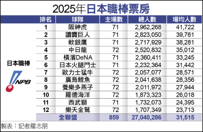日職更恐怖,場均破3萬人,12隊就有6隊場均超過3萬人,以阪神虎的4萬1722人最多,樂