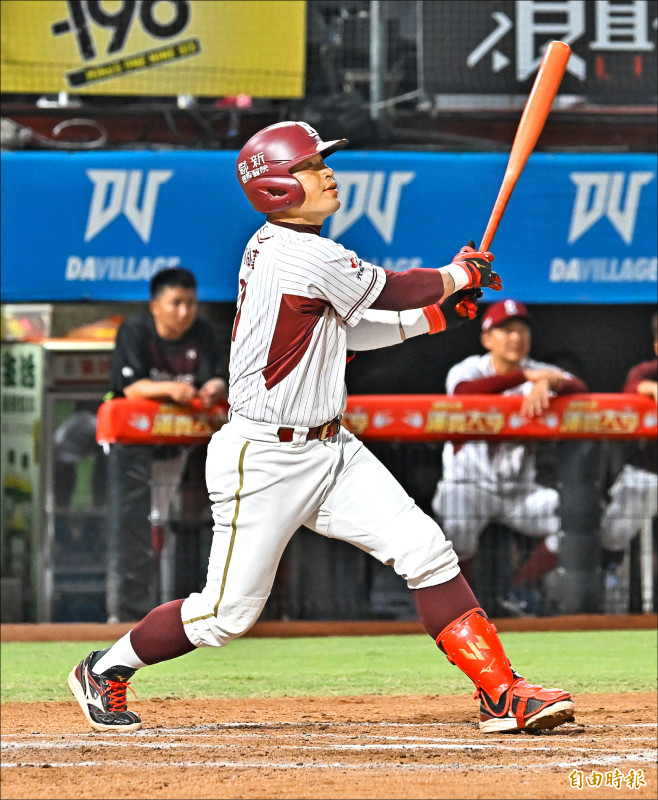 猿隊林泓育3安猛打賞,包括2局下敲出生涯季後挑戰賽首支全壘打。 (記者陳志曲攝)