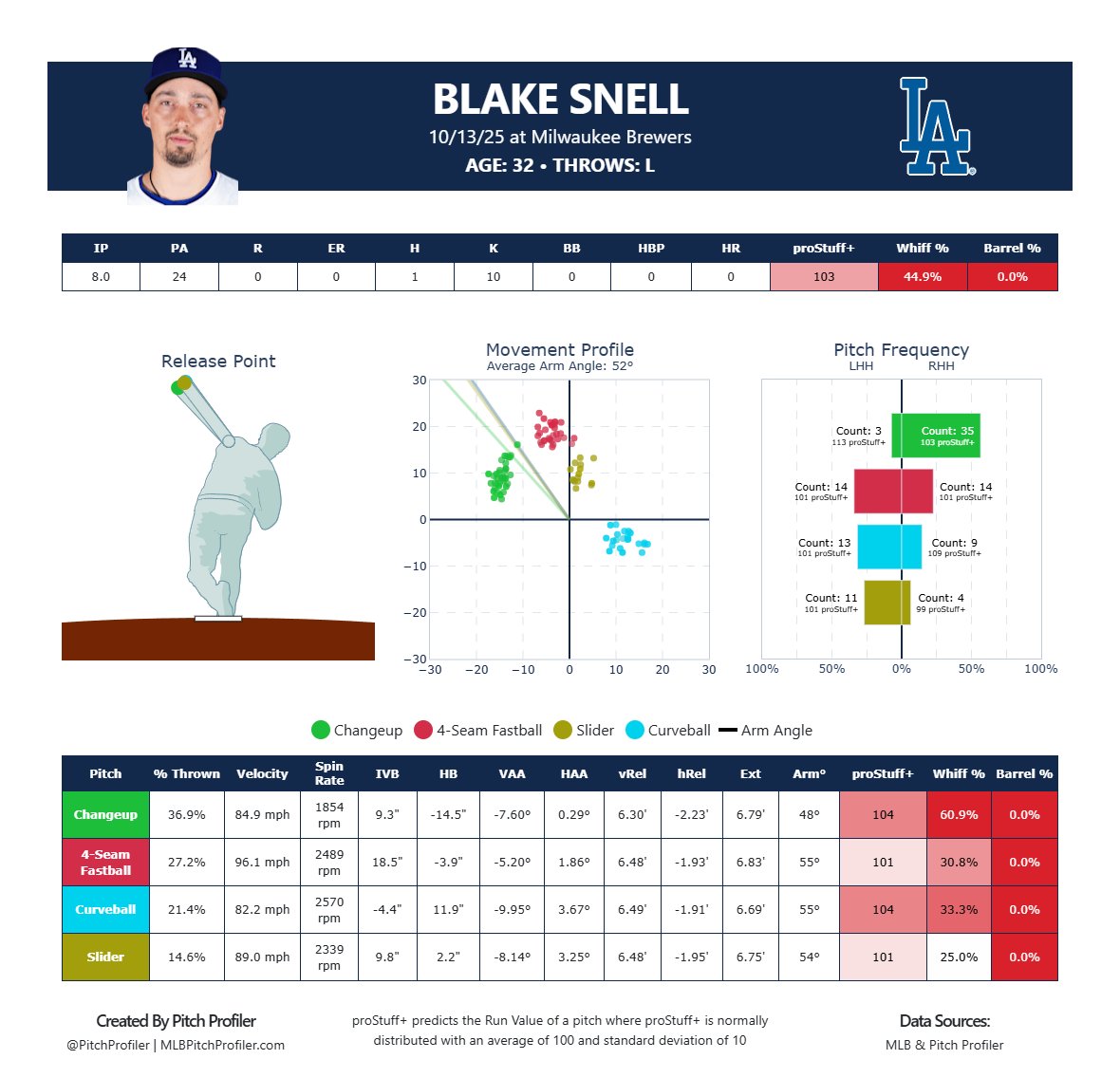 道奇靠Snell (8局 1H 0BB 10K) 無失分好投險勝釀酒人