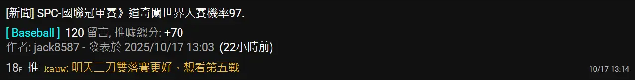 看板Baseball (棒球)作者water62036 (water62026)時間5小時前 (2025/10/18 11:38)推噓73(74推 1噓 48→)留言123則, 108人參與討論串1/1