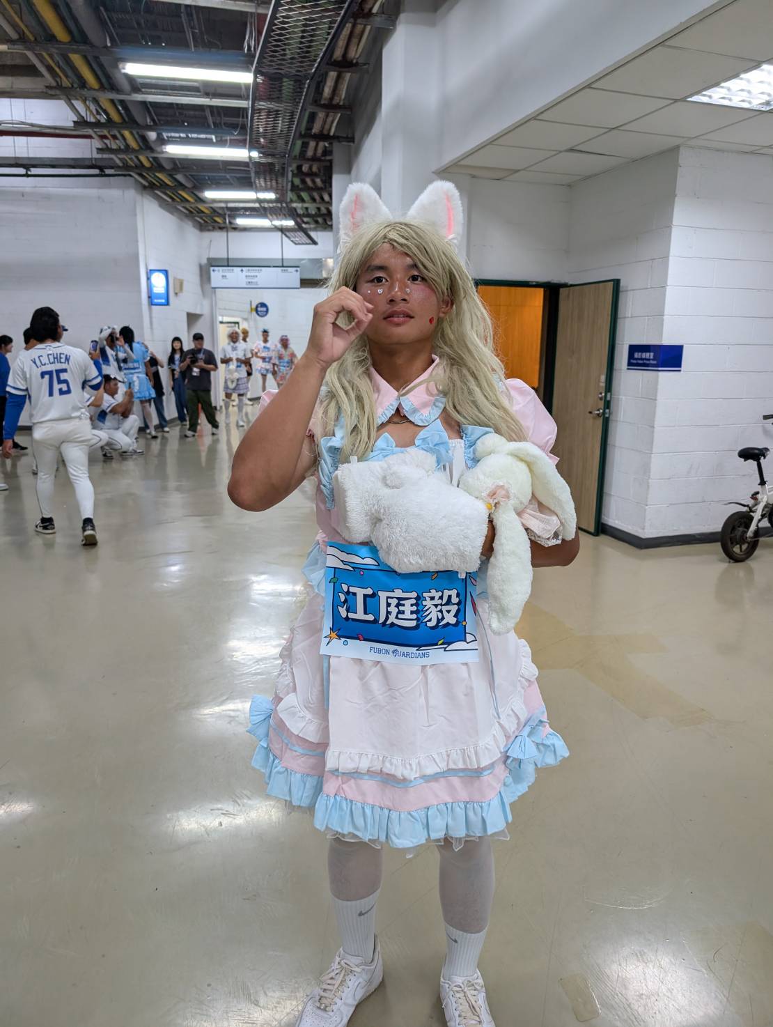 其中,第四指名捕手江庭毅穿上淺藍、淺粉配色的女僕裝登場,他害羞地說:「我也不知