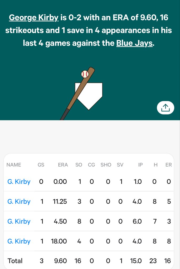 曾經在2022季後外卡輪G2對藍鳥(當時水手1-0聽牌)