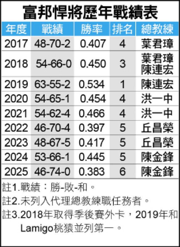 陳金鋒2022年帶領富邦悍將二軍奪得冠軍,去年升任一軍總教練,戰績排名第5,只贏過
