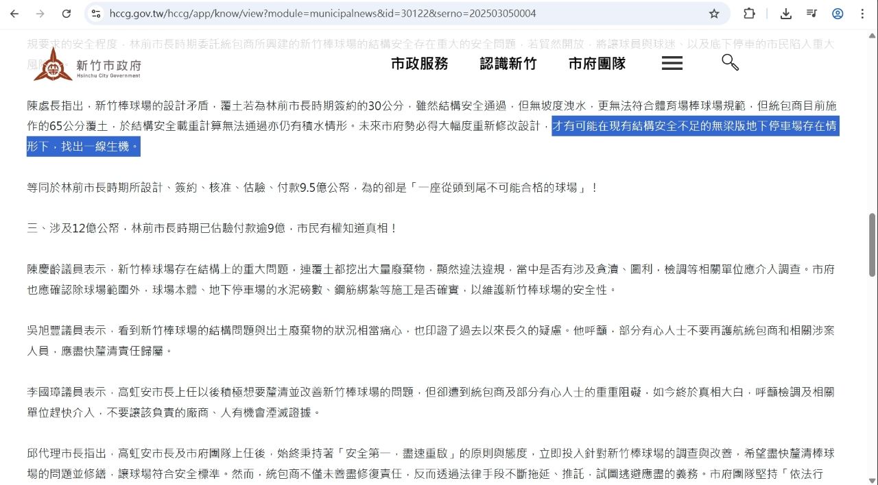 Re: [新聞]新竹棒球場錯假言論滿天飛 竹市府澄清:依法推進改善工程、對統包商求償