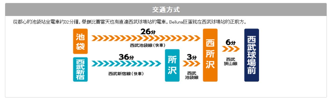 從東京池袋站搭電車約40分鐘即可抵達西武球場。截圖自西武師官網