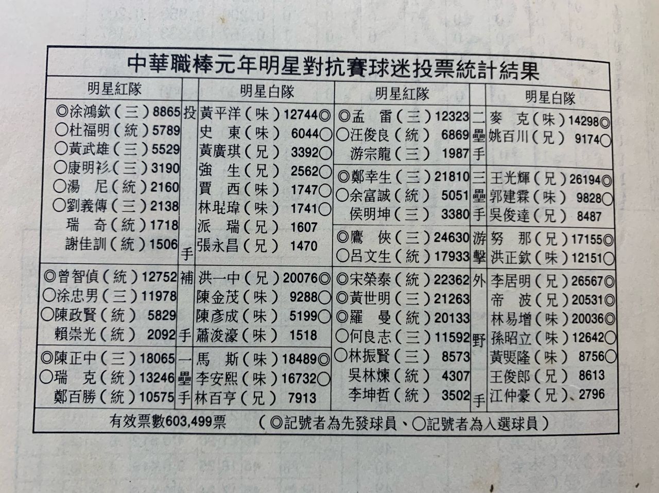 元年明星賽票選紀錄(龍象一隊,味全的星度不輸兄弟)