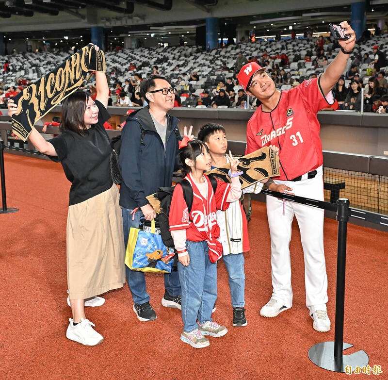 味全龍林智勝(右)與球迷合影。(記者陳志曲攝)