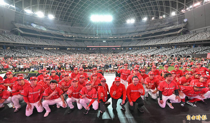 味全龍全體隊職員與球迷合影。(記者陳志曲攝)