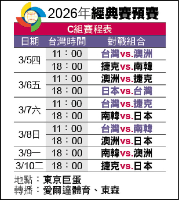 WBC共20國參賽,日韓和台灣預賽分在東京巨蛋的C組,同組還有澳洲和捷克,一般預料台