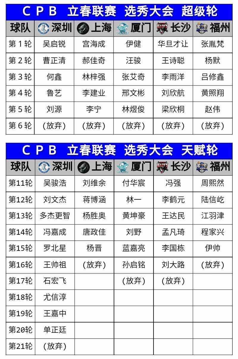 〔記者羅志朋/台北報導〕中國棒球城市聯賽CPB(Chinese Professional Baseball,CPB)明年1月開打,有5隊參賽,包含長沙旺旺黑皮、廈門海豚、深圳藍襪、福州海俠和上海正大龍,今天在深圳進行選秀會,前富邦悍將外野手王詩聰在第2輪獲長沙旺旺黑皮指名,眾所矚目的林益全和曹錦輝並未在選秀名單。