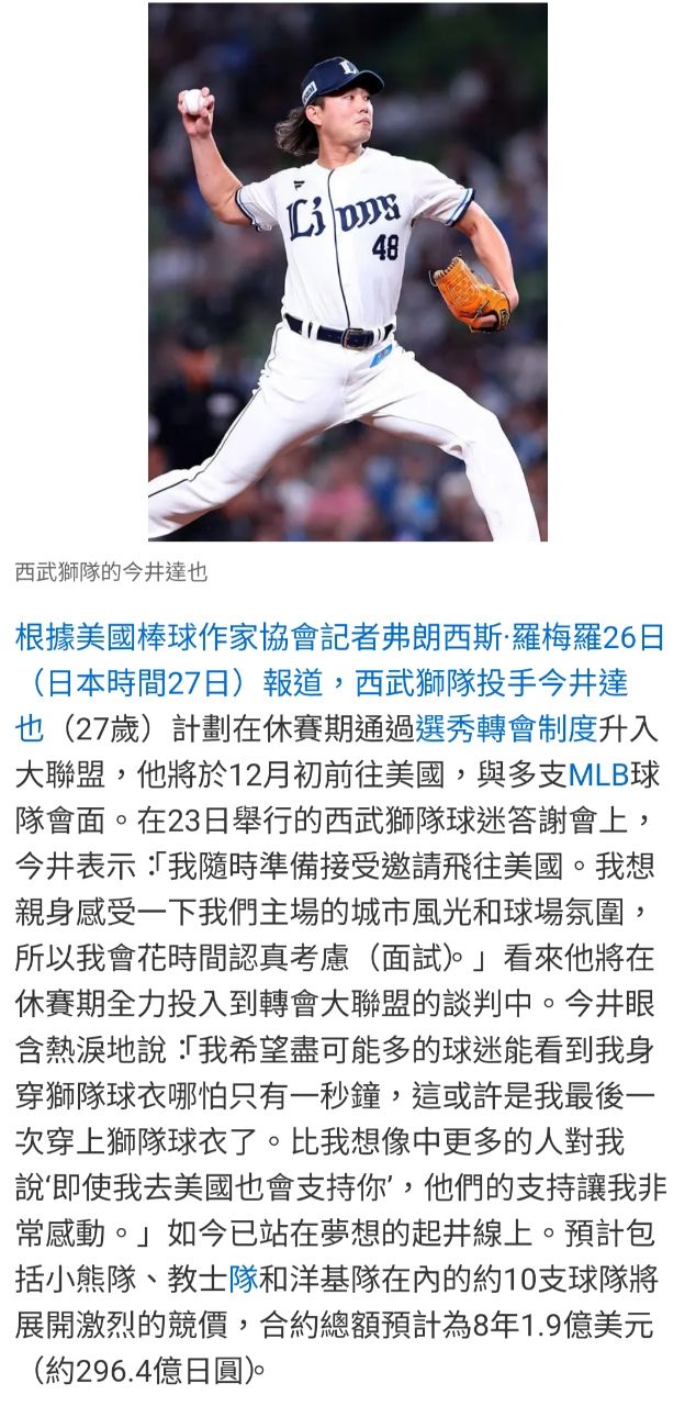 根據消息來源,今井達也預計會在12月的第一天前往美國,並與多支球隊會面