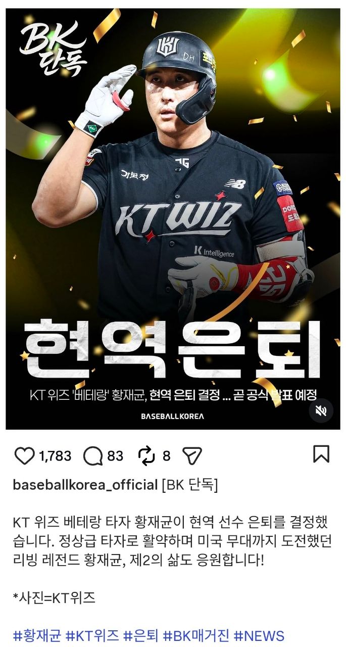 KT魔法師,內野手黃載均突然決定退役,結束了20年的職業生涯。