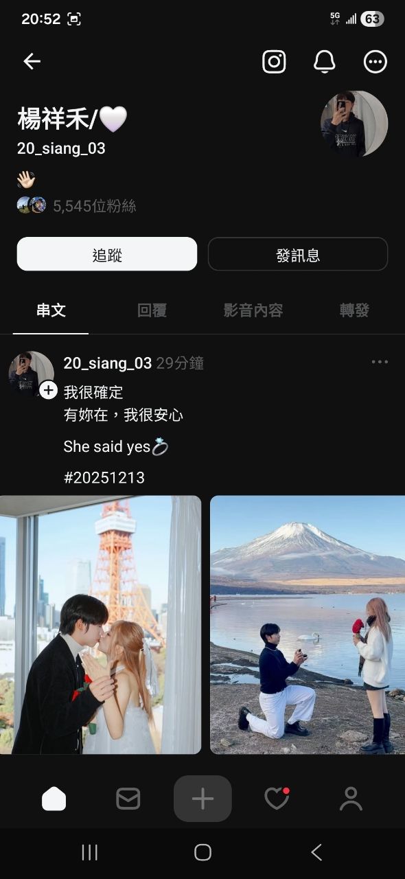 在Threads上宣佈跟女朋友求婚成功啦!
