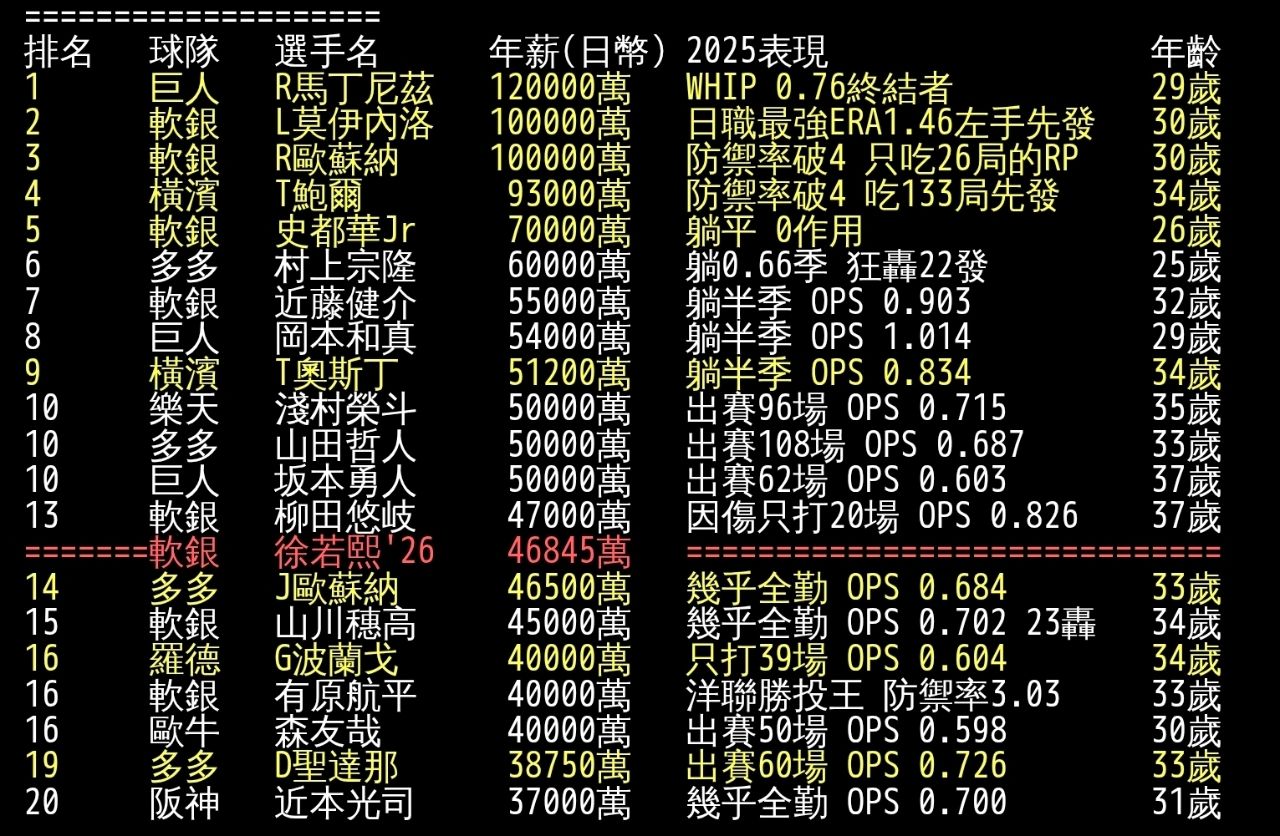 排名 球隊 選手名 年薪(日幣) 2025表現 年齡
