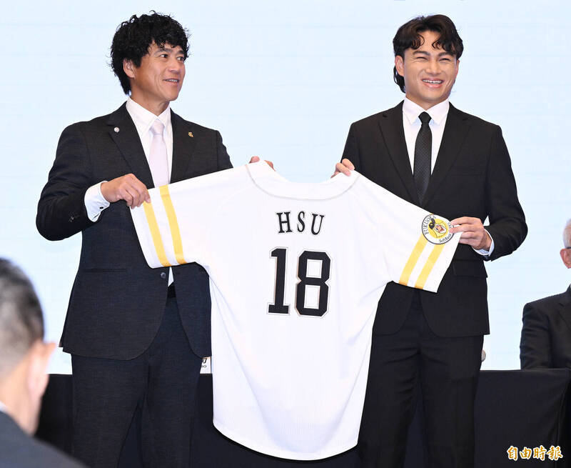 味全龍投手徐若熙(右)26日進行加盟日本福岡軟體銀行鷹記者會,軟銀CBO城島健司