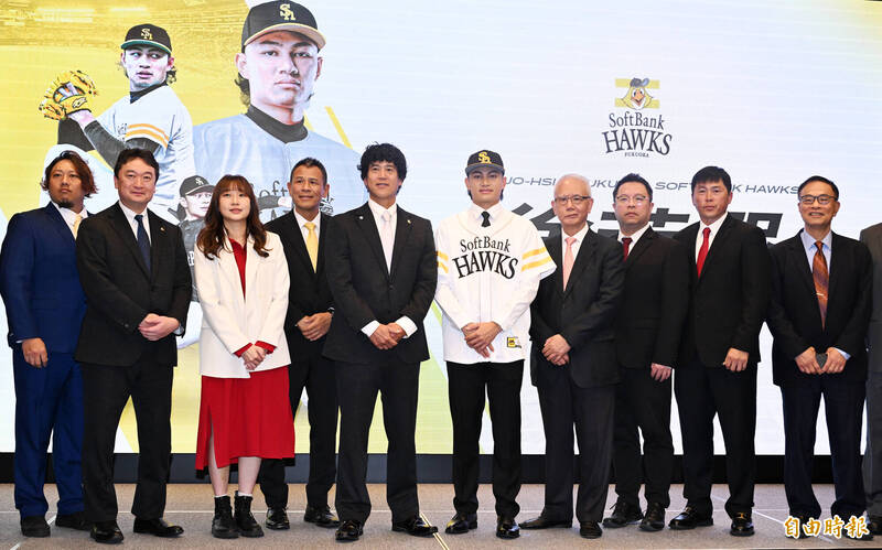 味全龍投手徐若熙(右五)26日進行加盟日本福岡軟體銀行鷹記者會。(記者廖振輝攝)