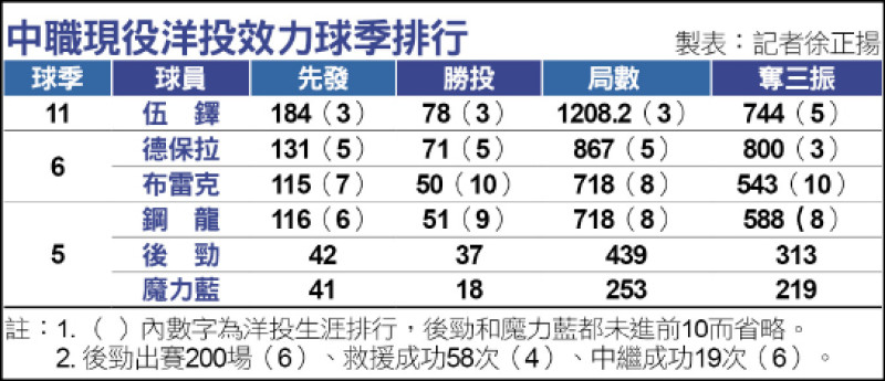 中職現役洋投效力球季排行