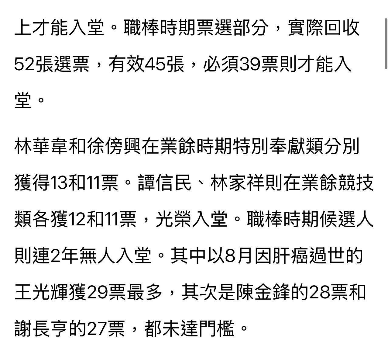 彭政閔獲42票,通過門檻,成為入堂名人。