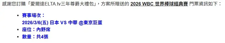 1. ELTA.tv尊爵大禮包送WBC門票賀成交方案,今晚預計22:00起陸續寄信至各位註冊信箱