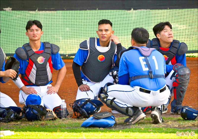 昨訓練到一個段落,幾位捕手圍成一圈討論,林岱安表示:「當時在討論暗號,也談到比