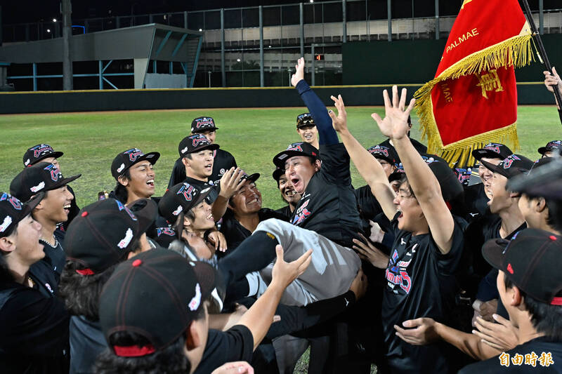 台北市大總教練王宜民(中)被拋起慶祝。(記者陳志曲攝)