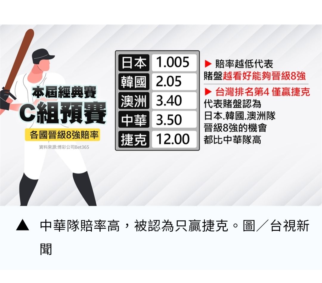 [新聞] 經典賽C組晉8強賠率出爐!中華隊被看扁倒數 傳韓「棄日抓台」拚戰