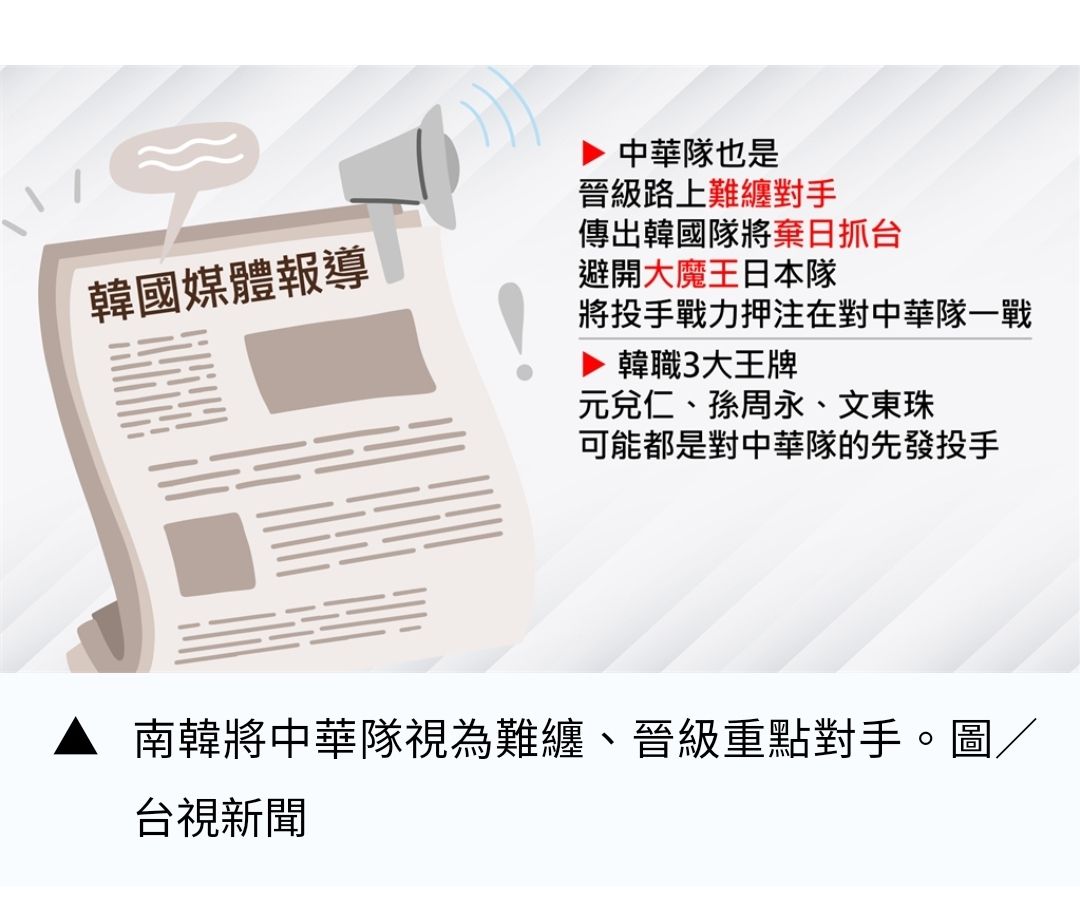 韓國媒體則報導,中華隊同樣是晉級路上的「難纏對手」,傳出韓國隊將「棄日抓台」避