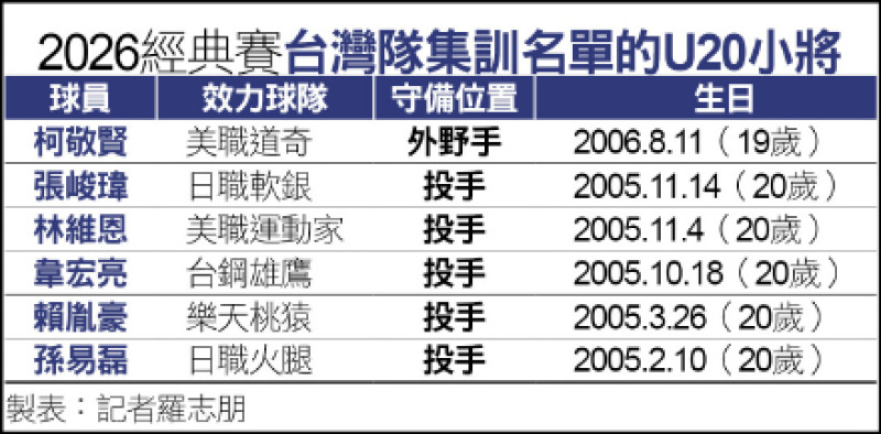 正在國訓中心備戰的台灣隊集訓名單中,有5名年僅20歲的投手,包括林維恩、張峻瑋、