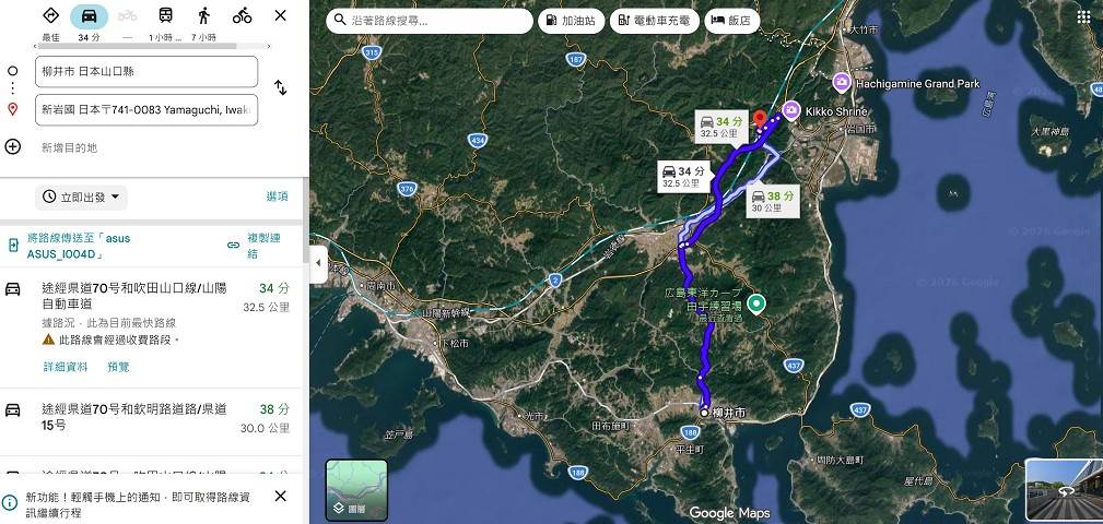 PS:新神戶車站→廣島站→新岩国站→柳井市→由宇練習場,地圖看來是繞了很大一圈耶