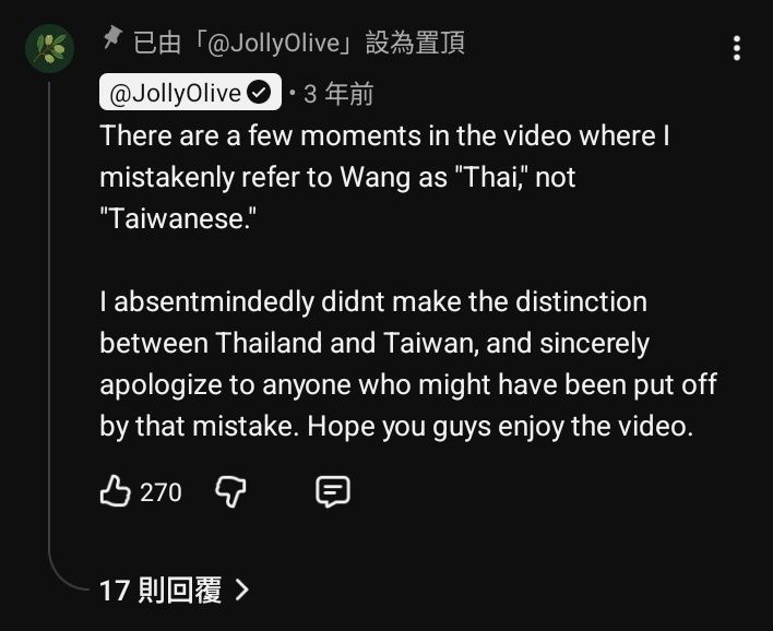 「影片中有幾個片段,我不小心把 Wang 稱呼為『泰國人 (Thai)』而非『台灣人 (Tai