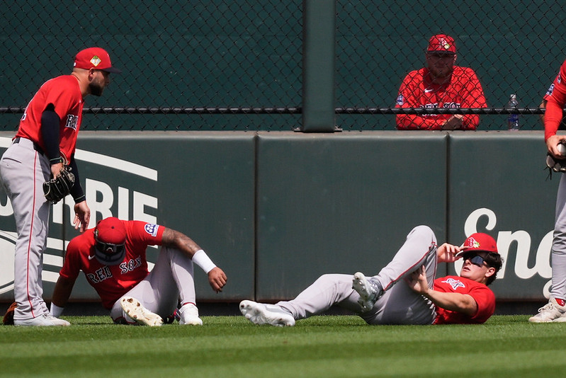 波士頓紅襪2大主力Roman Anthony與Ceddanne Rafaela今天在春訓熱身賽中相撞倒地,讓