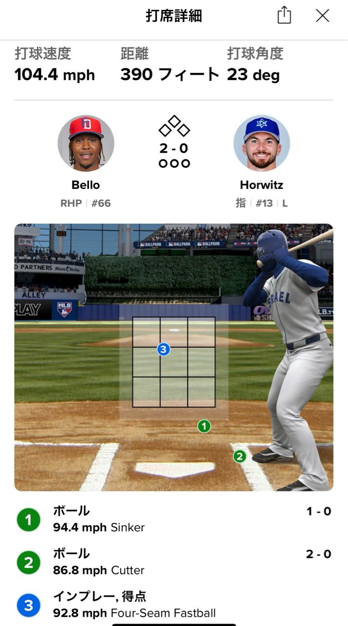 仰角23度,擊球初速104.4mph