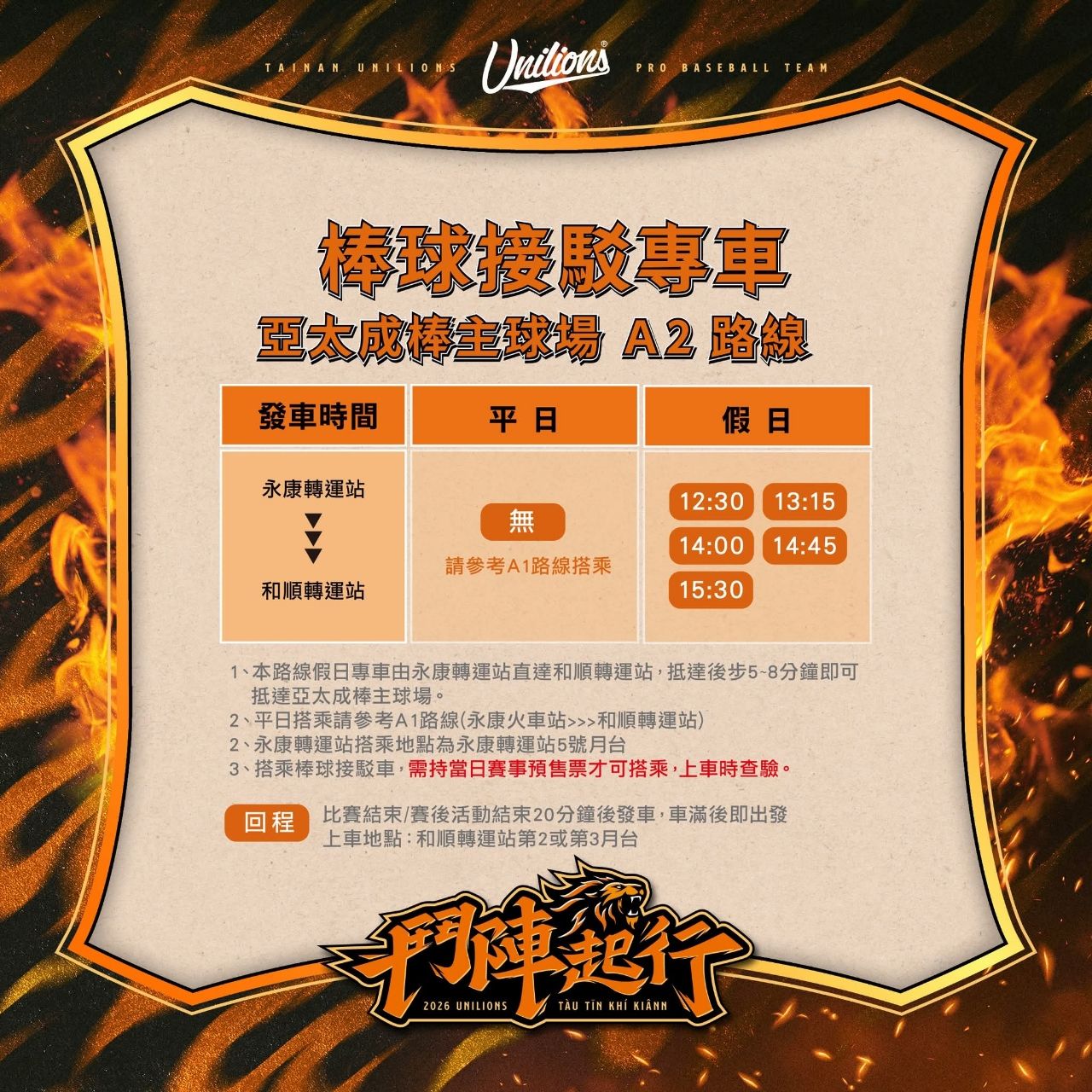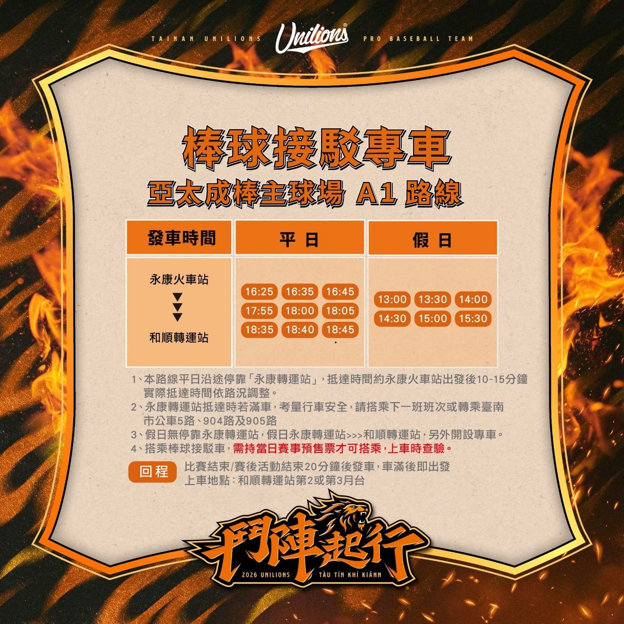 比賽結束/賽後活動結束20分鐘後發車,車滿後即出發上車地點:和順轉運站第2或第3月