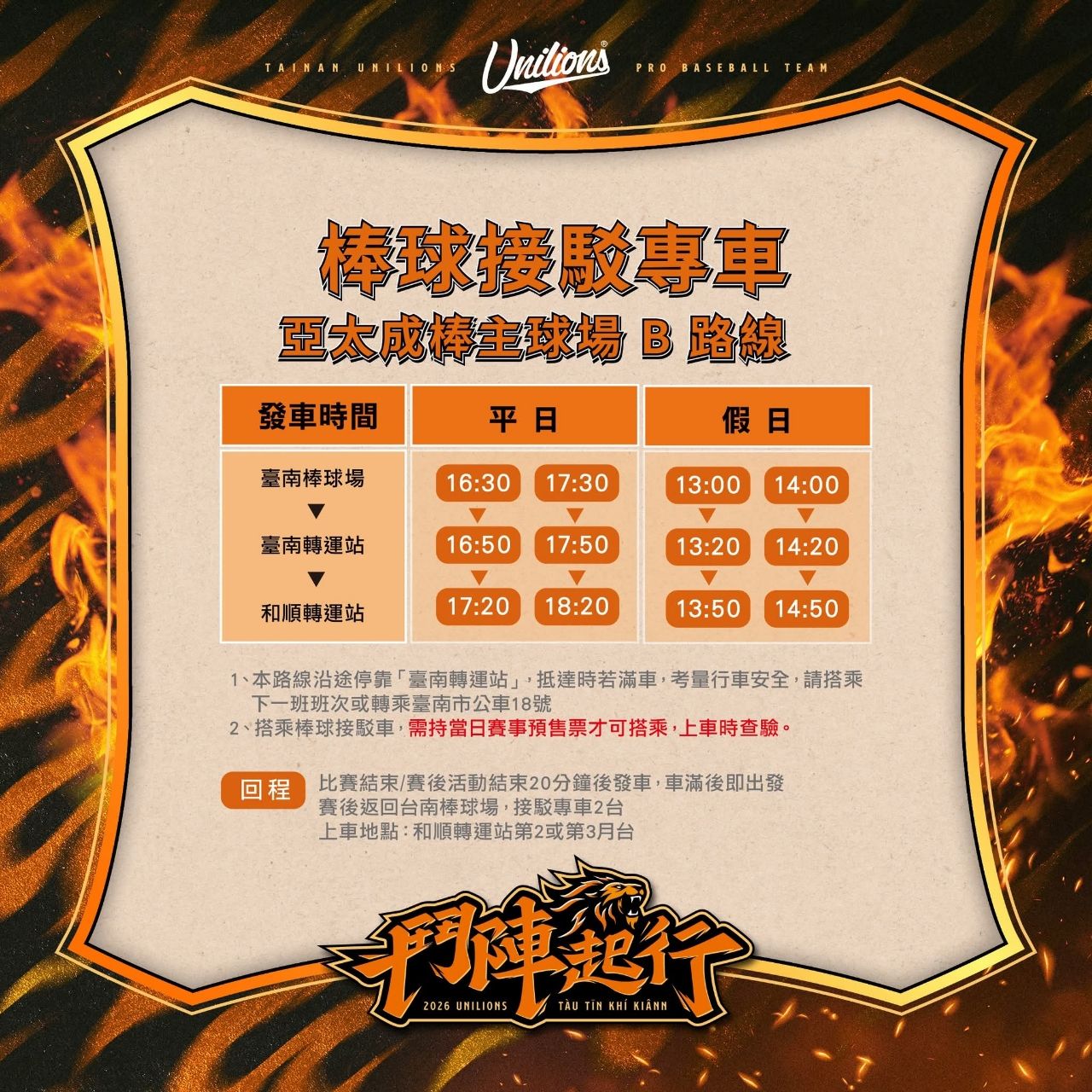 比賽結束/賽後活動結束20分鐘後發車,車滿後即出發賽後返回台南棒球場,接駁專車2台