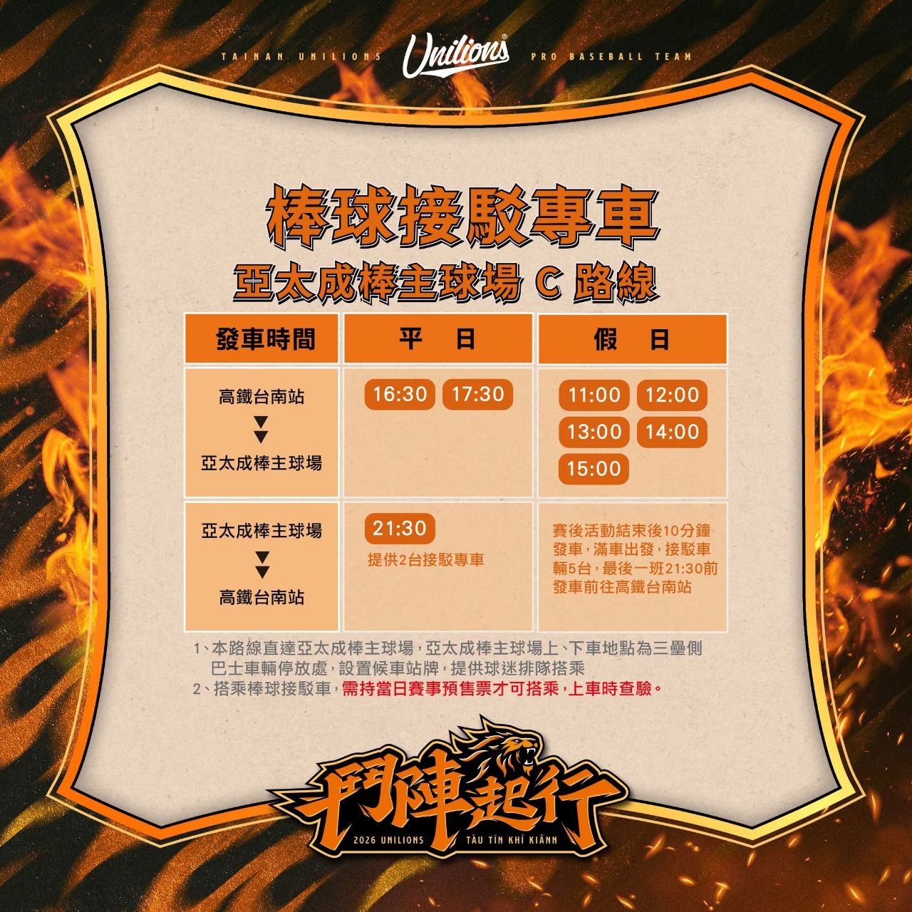 1、本路線直達亞太成棒主球場,亞太成棒主球場上、下車地點為三壘側巴士車輛停放處