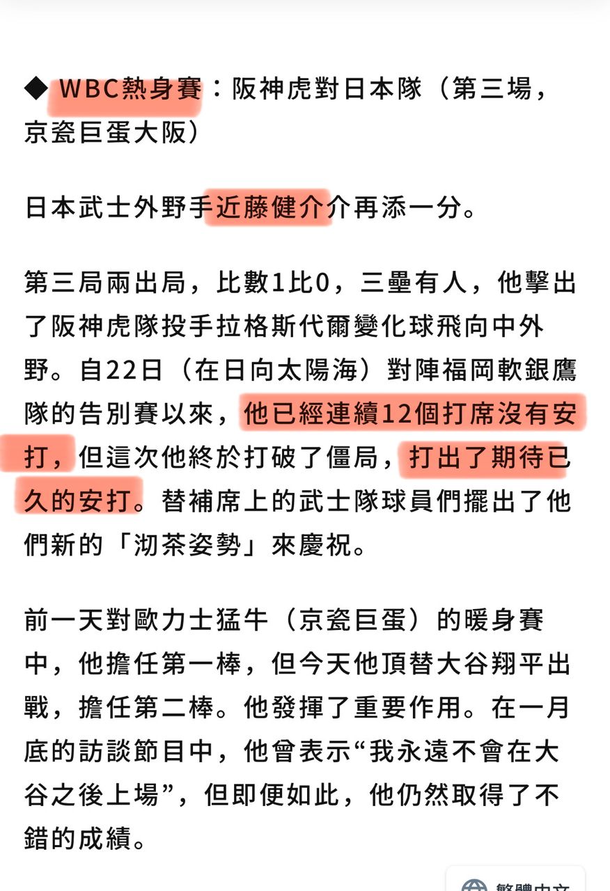 你以為是wbc強度太強近藤才沒打好嗎?沒有,近藤在熱身賽就已經出現過12支0了,勉強