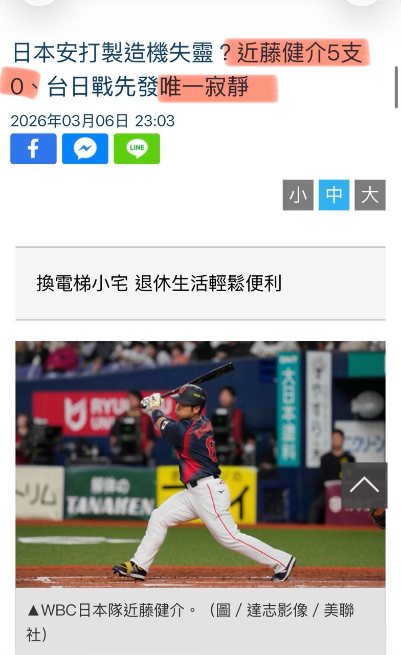 連對上中華隊,大谷的快樂隊友都在暢打扣倒台灣的時候,近藤是唯一個5支0的打者,打