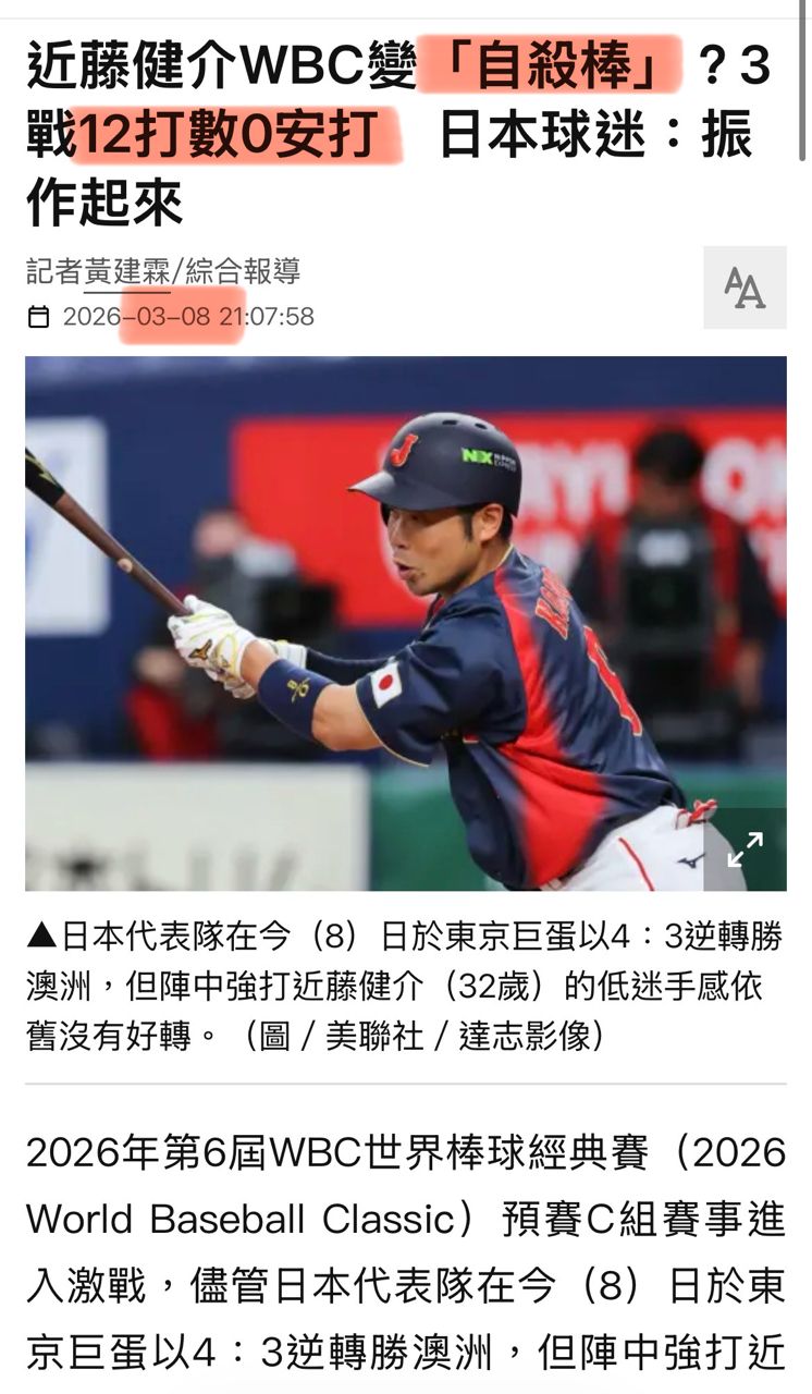 應該很多人很意外近藤健介這個日職的打擊王,居然整個wbc,「13支0,吞3K,打擊率0