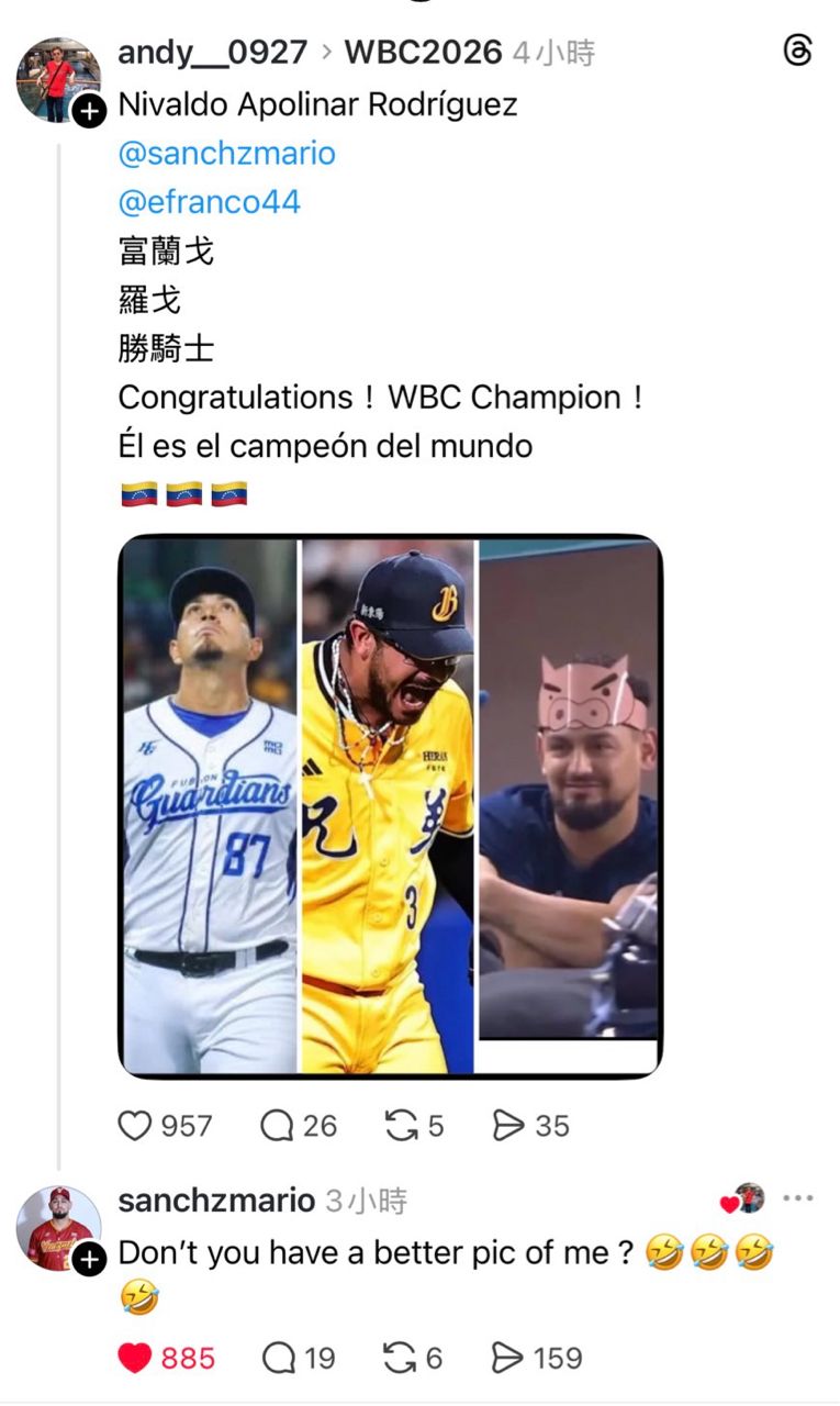 富藍戈,今天稍早,富藍戈也在個人Threads上po文,歡慶委內瑞拉奪冠。
