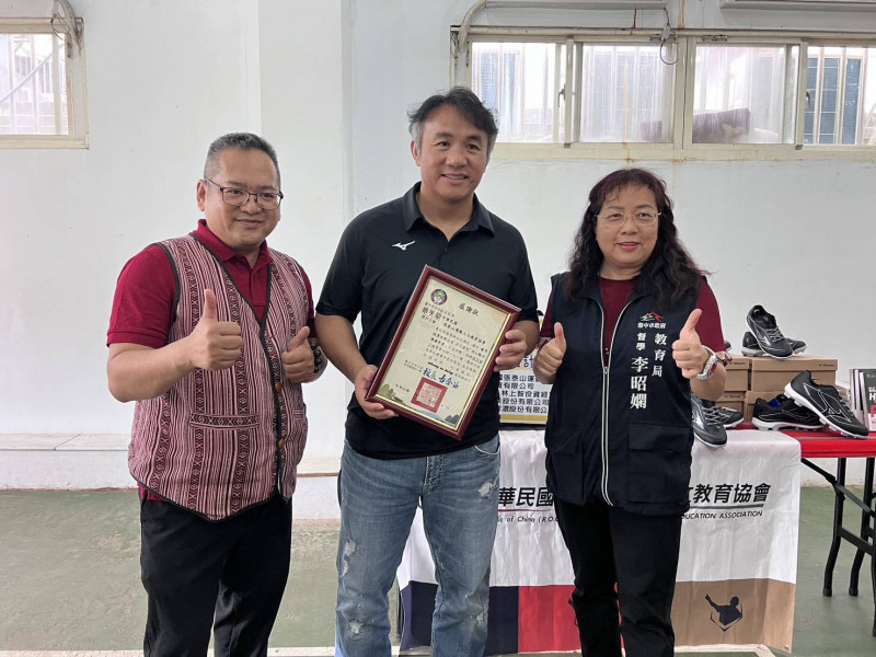 德芙蘭國小校長古金益(左)致贈感謝狀,感謝張泰山(中)。(教育局提供)