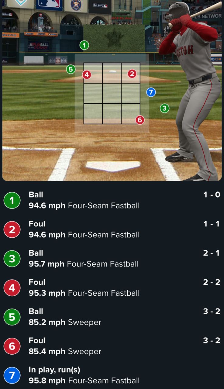 第三個打席靠著捕手Vazquez在兩好兩壞時投出的第五球挑戰ABS成功形成三振出局