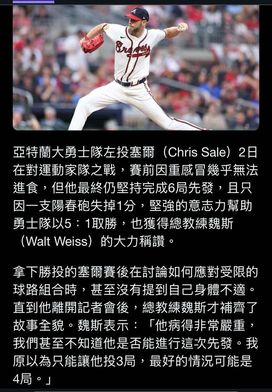 [分享] 今日 Chris Sale 六局失一分 二連勝
