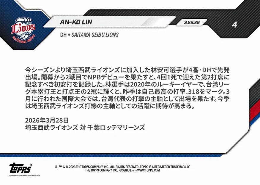 自本賽季起加入埼玉西武獅的林安可選手,以第4棒、指定打擊身分先發出場。在開幕後