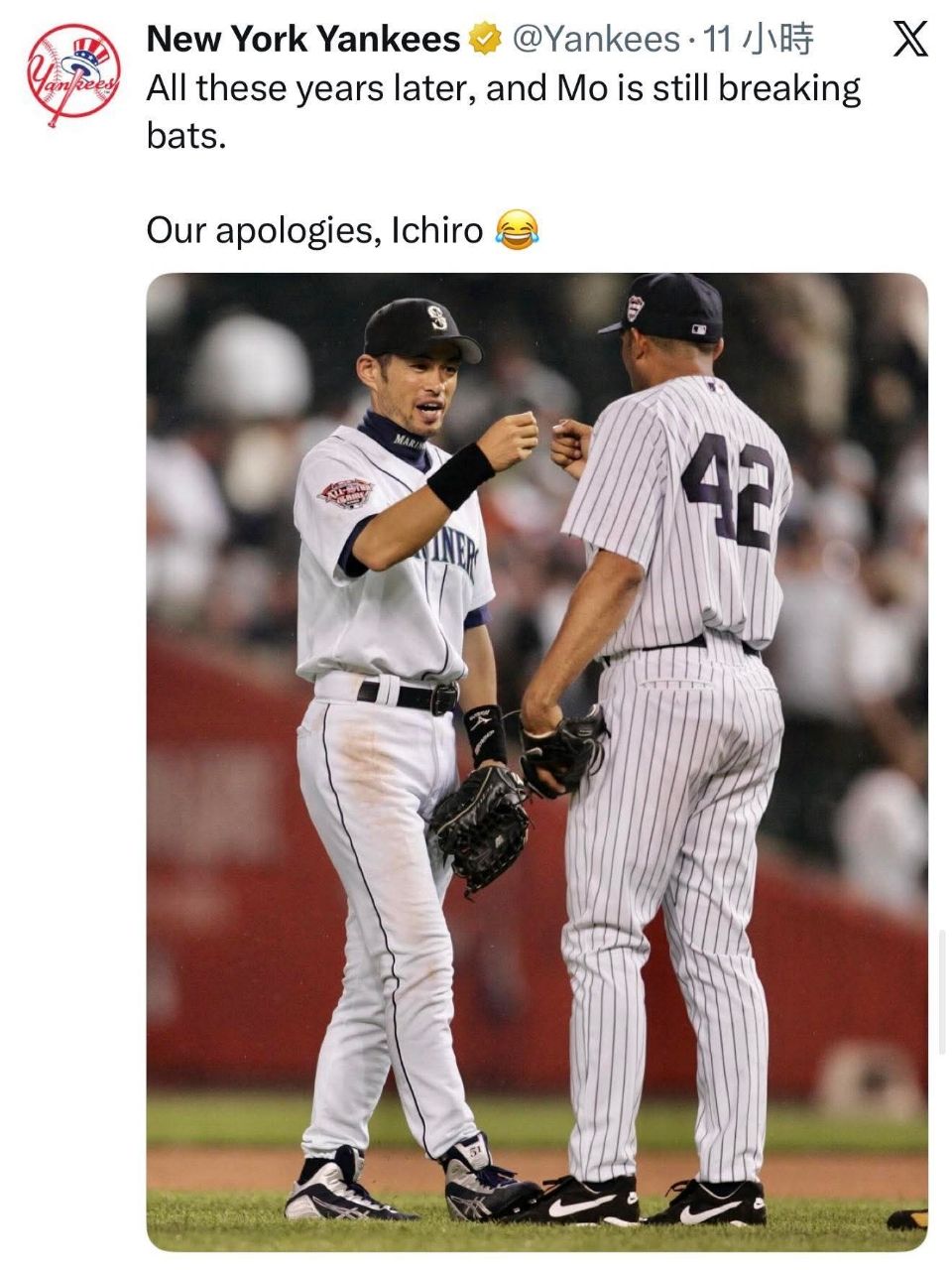 對於今天銅像揭幕式球棒斷裂的意外,#鈴木一朗 搬出李維拉(Mariano Rivera)來救援