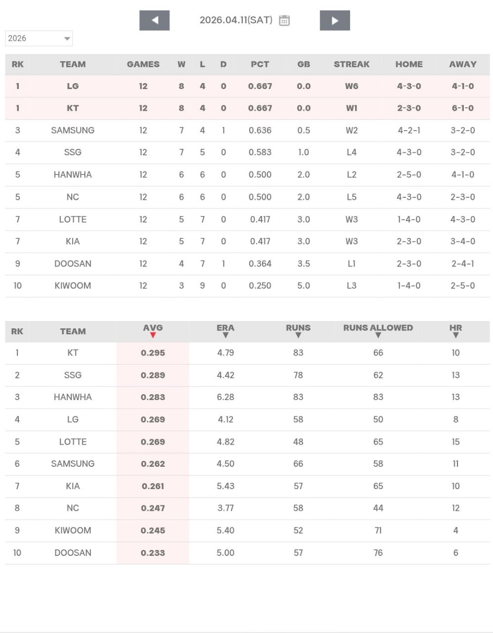 ☆2026戰績(~4/11)(來源:KBO官網)